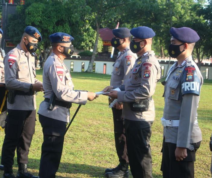 BATAM – Komandan Satuan Brimob Polda Kepri, Kombes Pol. Mohamad Rendra Salipu, S.I.K.,M.Si menyerahkan piagam penghargaan kepada 36 personel Satbrimob Polda Kepri di lapangan apel Mako Satbrimob Jl. Raya Trans Brelang KM 1 Tembesi. Rabu (2/6/2021).