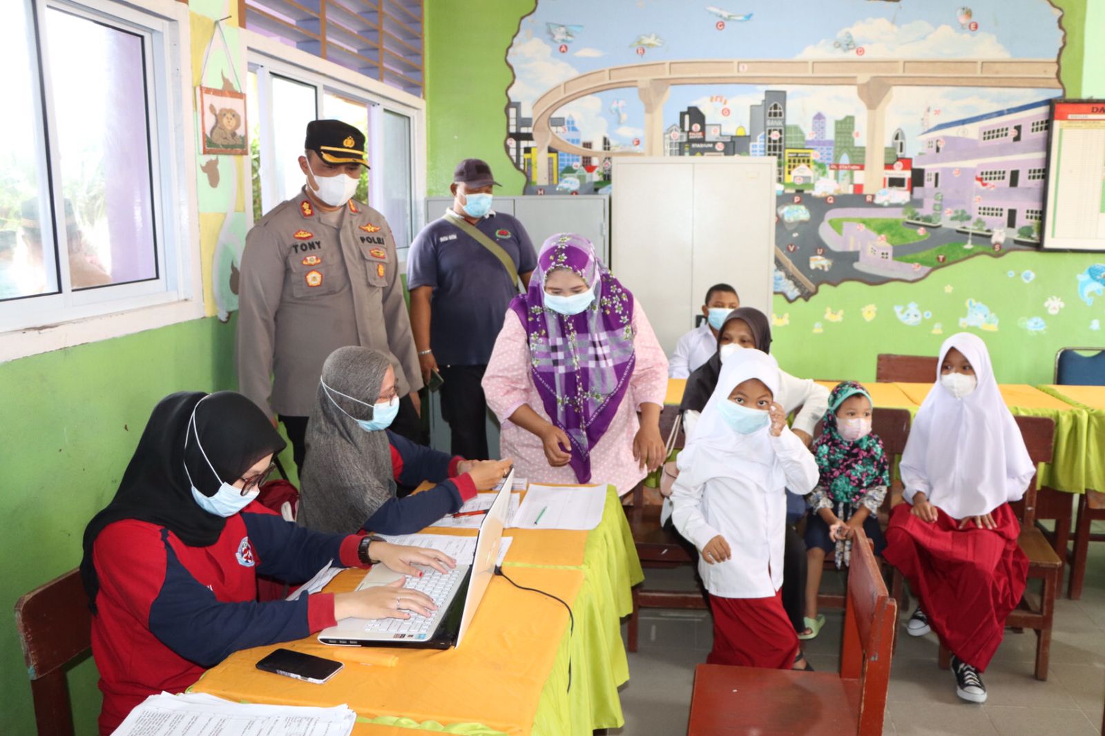 “Ini merupakan vaksinasi pertama yang digelar bagi anak usia 6 sampai 11 tahun sesuai perintah dari Presiden Joko Widodo untuk mendukung vaksinasi anak yangmana hari ini secara resmi Launching Se-Provinsi Kepulauan Riau secara Virtual melalui sarana Vicon oleh Gubernur Kepri H. Ansar Ahmad. SE. MM,” terang Kapolres Karimun AKBP TONY PANTANO, SIK, SH