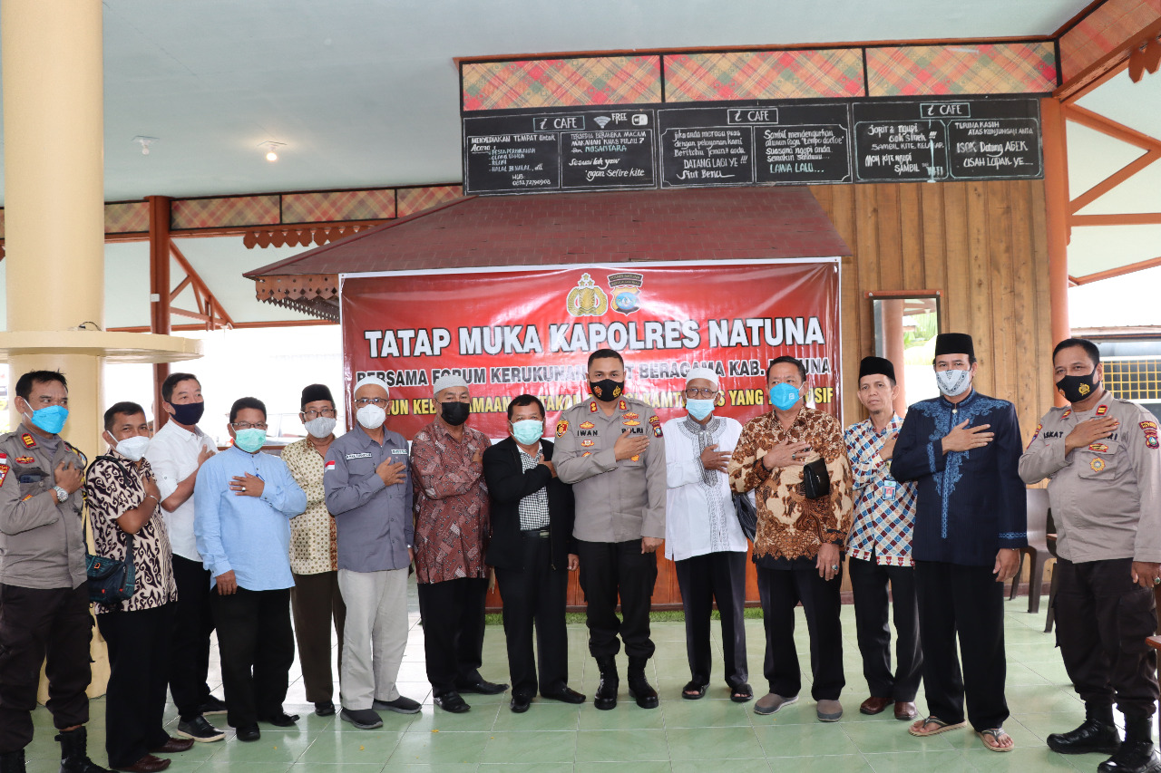 NATUNA – Guna meningkatkan hubungan silaturahmi antar umat beragama di Natuna terutama menjelang Perayaan Ibadah Natal dan Tahun Baru agar berlangsung dengan aman dan kondusif, Polres Natuna laksanakan kegiatan silaturahmi dan tatap muka bersama Forum Kerukunan Umat Beragama Natuna dengan tema “Bangun Kebersamaan Ciptakan Situasi Kamtibmas yg Kondusif”. Kegiatan di pimpin langsung oleh Kapolres Natuna AKBP Iwan Ariyandhy, S.I.K., M.H. dan di laksanakan di Caffe Ranai Square, Rabu (08/12/2021).