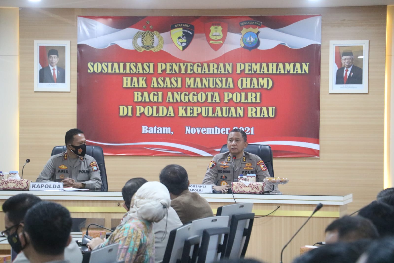 Kegiatan sosialisasi berlangsung di Rupatama Polda Kepri dan dihadiri oleh Koorsahli Kapolri Irjen. Pol. Prof. Dr. Eko Indra Heri, M.M., Kapolda Kepri Irjen Pol Dr. Aris Budiman, M.Si., Staf Ahli Kapolri Bidang HAM beserta Tim, Pejabat Utama Polda Kepri, Para Kasatwil Jajaran Polda Kepri dan Peserta Sosialisasi. Ucap Kasubbid Penmas Bid Humas Polda Kepri Kompol Robby Topan Manusiwa, S.IK.
