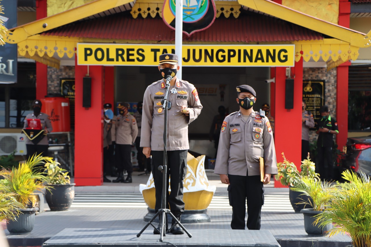 TANJUNGPINANG – Kapolres Tanjungpinang AKBP FERNANDO, SH, SIK memimpin apel penutupan latja dan penyerahan siswa diktuk Bintara Polri Ta. 2021 SPN Polda Kepri di Polres Tanjungpinang yang telah selesai melaksanakan Latihan Kerja ( Latja ) di Polres Tanjungpinang yang dilaksanakan selama kurang lebih (10) sepuluh hari. Kamis (09/12/2021).