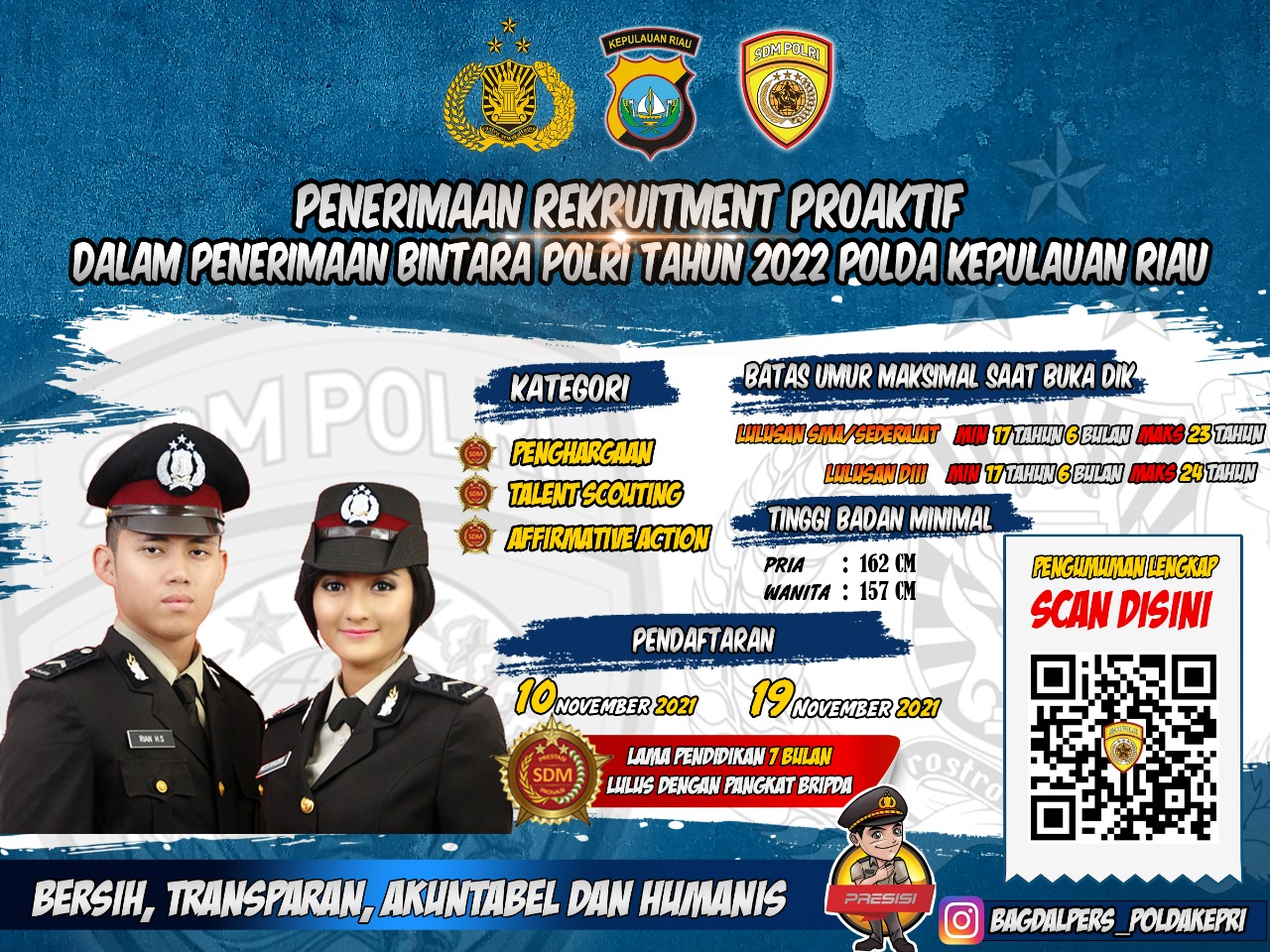 BATAM – Polda Kepulauan Riau sejak 10 November lalu telah membuka rekrutmen Proaktif Bintara Polri T.A.2022,dengan tiga kategori, yakni Kategori Afirmatif, Talent Scouting,dan penghargaan.