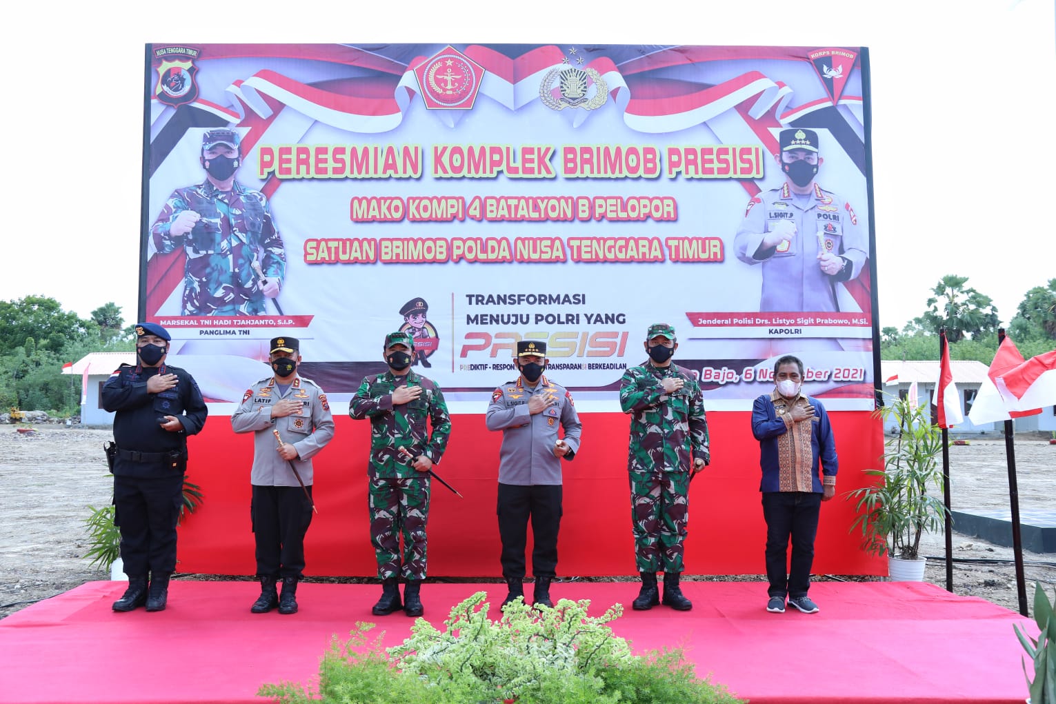 JAKARTA – Kapolri Jenderal Listyo Sigit Prabowo mengajak Panglima TNI Marsekal Hadi Tjahjanto bertatap muka dengan seluruh personel Brimob sekaligus meresmikan pembangunan kompleks Brimob Presisi Kompi 4 Balayon B Pelopor Manggarai Barat Satbrimob Polda NTT, Sabtu (6/11/2021).
